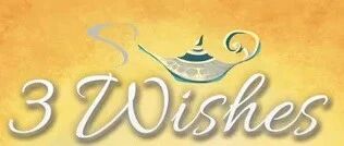 3 Wishes 游戏所有卡牌的平铺展示图,上方并排陈列着多种愿望卡,下方正中是印有神灯精灵的亮黄色游戏封面卡,整体插画风格生动且富有童趣。